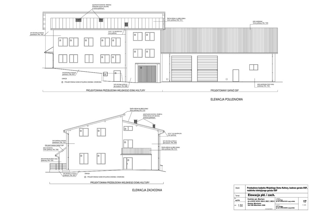 W ramach Rządowego Funduszu Inwestycji Lokalnych w miejscowości Koziniec gmina Mucharz powstanie nowa remiza dla druhów Ochotniczej Straży Pożarnej Koziniec-Centrum o łącznej pow. zabudowy 215,60 m², pow. użytkowa 199,52 m², kubatura 1.430,00 m³ – dwa stanowiska garażowe z częścią socjalno-magazynową. Konstrukcja stalowa z wypełnieniem ścian zewnętrznych płytą wielowarstwową.