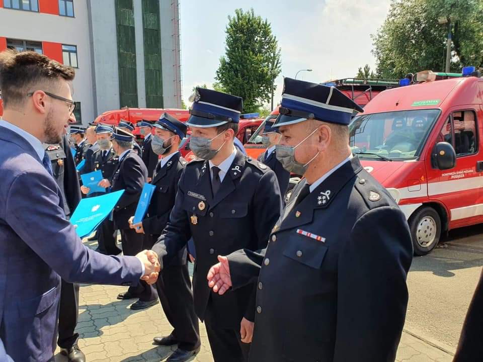 26.06.2020 był szczególnym dniem dla 5 jednostek Ochotniczej Straży Pożarnej z naszego powiatu, gdyż otrzymały promesy na zakup nowego średniego wozu ratowniczo- gaśniczego. Uroczyste przekazanie odbyło się na terenie Komendy Wojewódzkiej PSP w Krakowie. Łącznie liczba nowych samochodów w Małopolsce to 52 sztuki o łącznej wartości ponad 40 milionów złotych. Promesy na ręce ochotników przekazali małopolski Komendant Wojewódzki Państwowej Straży Pożarnej st. bryg. Piotr Filipek oraz wojewoda małopolski Piotr Ćwik. Środki w większości pochodzą z dotacji Ministerstwa Spraw Wewnętrznych i Administracji a także z środków rezerwy celowej budżetu państwa na przeciwdziałanie i usuwanie skutków klęsk żywiołowych. Zakupy zostały również wsparte dotacjami Krajowego Systemu Ratowniczo-Gaśniczego, pozostałe źródła finansowania to środki Narodowego Funduszu Ochrony Środowiska i Gospodarki Wodnej, samorządów terytorialnych, środki własne, a także środki przekazywane przez zakłady ubezpieczeń.