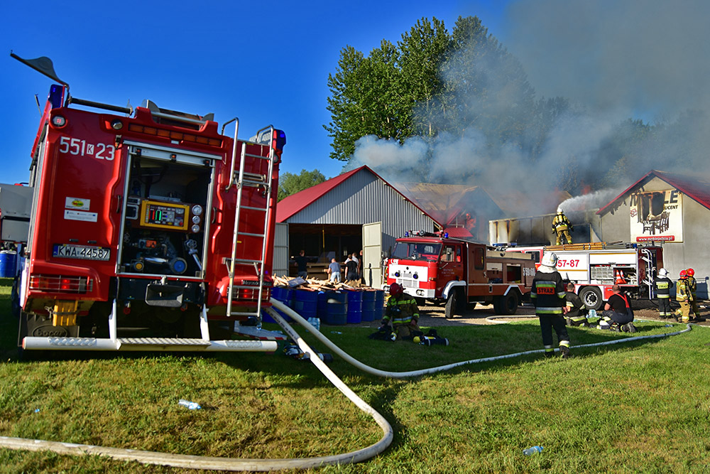 Na miejsce zdarzenia bardzo szybko zadysponowano liczne jednostki ochronny przeciwpożarowej. Po dotarciu na miejsce pierwszych zastępów jednostek OSP i rozpoznaniu zagrożenia stwierdzono rozwinięty pożar jednej hali produkcyjnych. Druhowie przystąpili do gaszenia ognia oraz obrony budynków w bezpośrednim zagrożeniu. Na miejsce dysponowano kolejne wozy strażackie i strażaków.