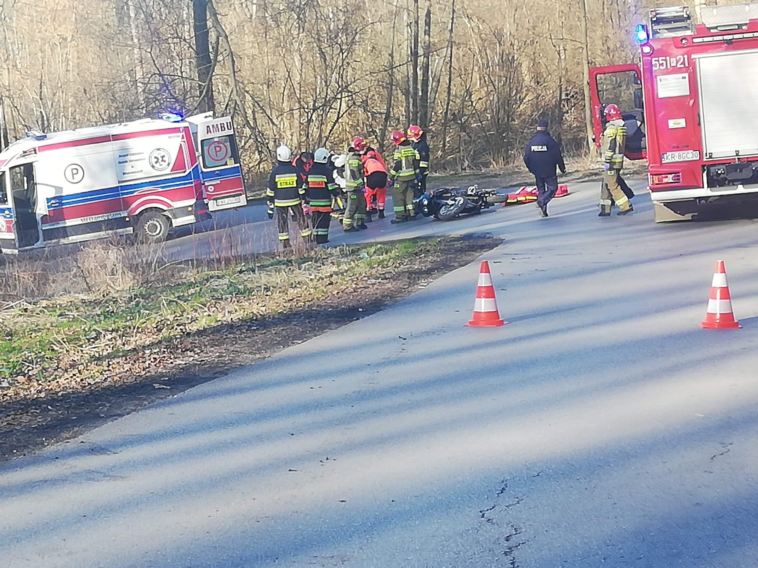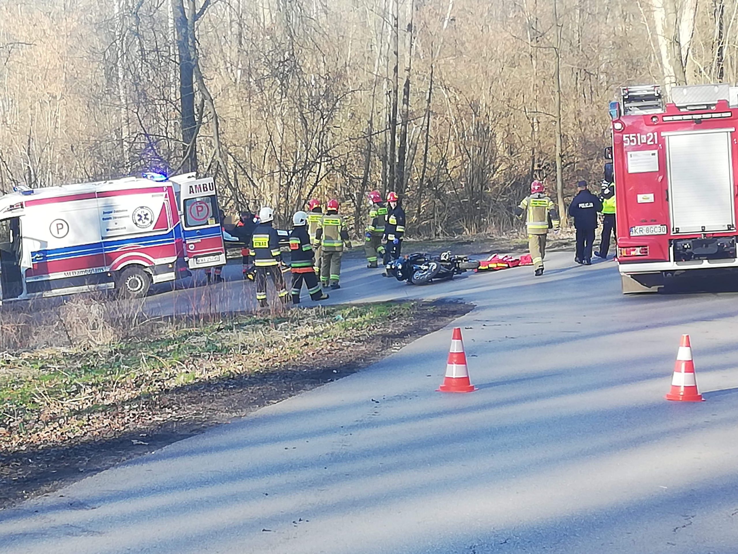 Służby po godzinie 15 w niedziele zostały zadysponowane do Tłuczani, w której doszło do zdarzenia drogowego z udziałem motocyklisty. Poruszający się pojazdem stracił panowanie nad pojazdem i wpadł w poślizg na zakręcie. Na miejscu interweniowali strażacy z JRG Wadowice oraz OSP Tłuczań. Poszkodowanym ze złamaną nogą zajął się przybyły Zespół Ratownictwa Medycznego, który zabrał mężczyznę do szpitala na dalszą diagnostykę. Ruch w tym miejscu był zablokowany, a patrol Policji zajmuję się wyjaśnieniem sprawy.