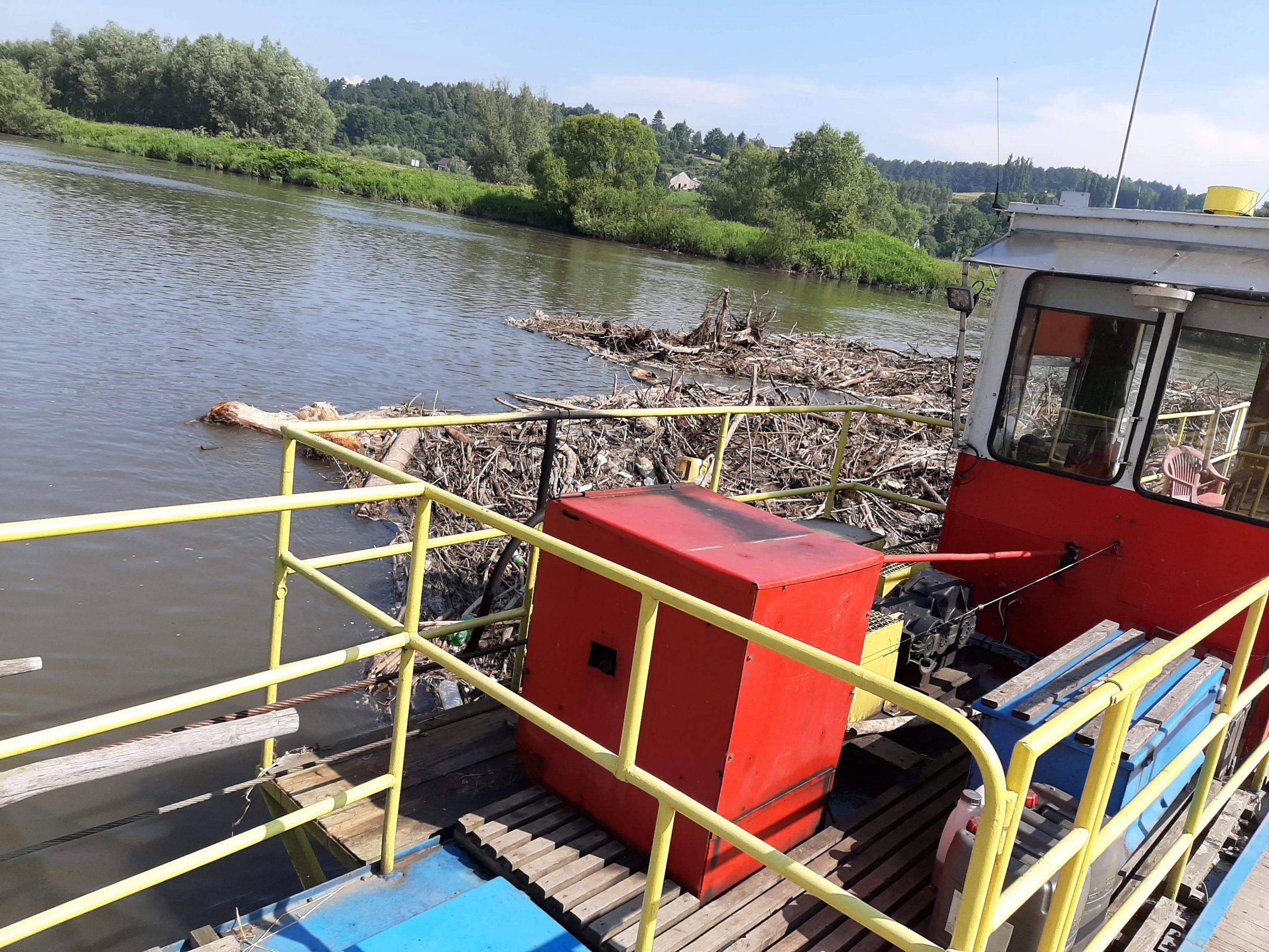 Kilkudniowe opady deszczu spowodowały podniesienie się stanu rzek. Rwące potoki i dopływy zabrały ze sobą zalegające gałęzie , korzenie i śmieci, które zatrzymały się na przeprawie promowej w Spytkowicach.